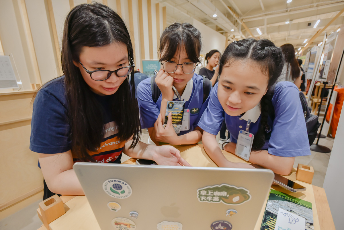 Yeow Shuen Yi (middle) with her teammate during the Gallery Walk Exhibition. (Photo by Goh Shoo Weng)