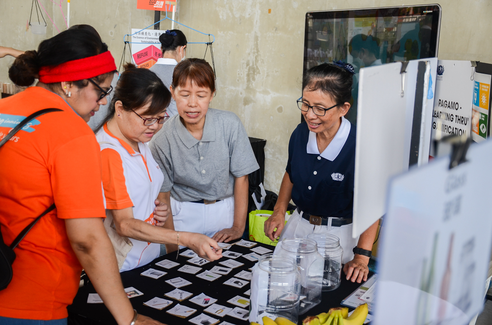 Susan Tan, manager of Tzu Chi Environmental Sustainability Department (front row, first from left), sharing with Dr. Amy Khor, Senior Minister of State for Transport and Senior Minister of State for Sustainability (front row, second from left), about the 17 Sustainable Development Goals covered by this year's event. (Photo by Pua Poo Toong)