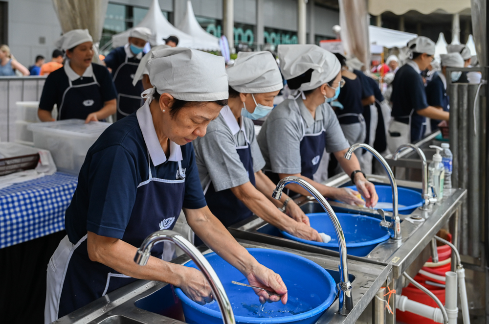 One of the most notable features on-site was the well-organised and clean dishwashing area. To achieve comprehensive green environmental protection, the food area strictly avoided using disposable utensils. Volunteers at the dishwashing area meticulously cleaned each utensil before returning it to the food stalls for reuse.