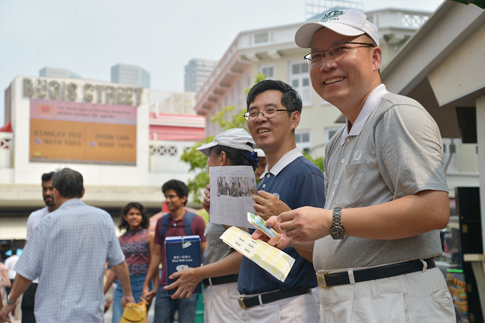 In 2019, Tan Ching Swee (second from right) participated in the Tzu Chi Island-wide Flag Day. He believed that the key to fundraising lies in inspiring kindness in people. (Photo by Pua Poo Toong)