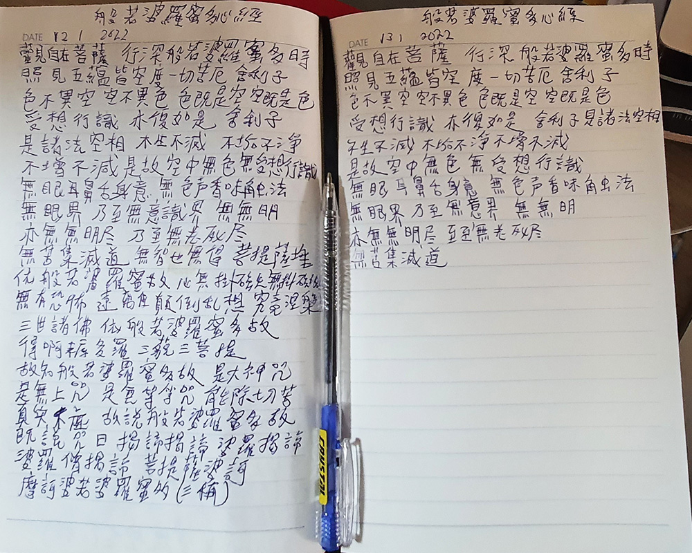 Tan Ching Swee copied the Heart Sutra word by word despite suffering from the pain arising from his illness. (Photo by Tan Susan)