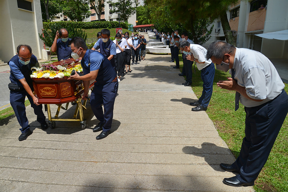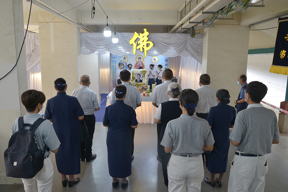 A solemn mourning hall was set up at the void deck of the HDB flat. Due to the pandemic restrictions, Tzu Chi Friends-in-Dharma, colleagues and neighbours came in batches to pay respect, but it was still an endless stream of people. During the daytime, volunteers from Tzu Chi South District were on duty in the wake while the Logistics team manned during the night. This was testament to the sincere and warm affinity Chin Swee had built with those around him.