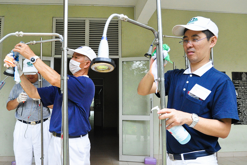 At a Tzu Chi's overseas free clinic, Tan Ching Swee spares no effort to support the long-distance transportation and assembly of equipment and tool. The photo showed Tan Ching Swee (right) wiping a surgical lamp carefully. (Photo by Law Sook Fong)