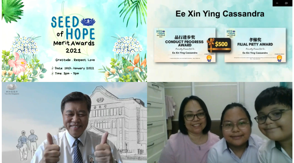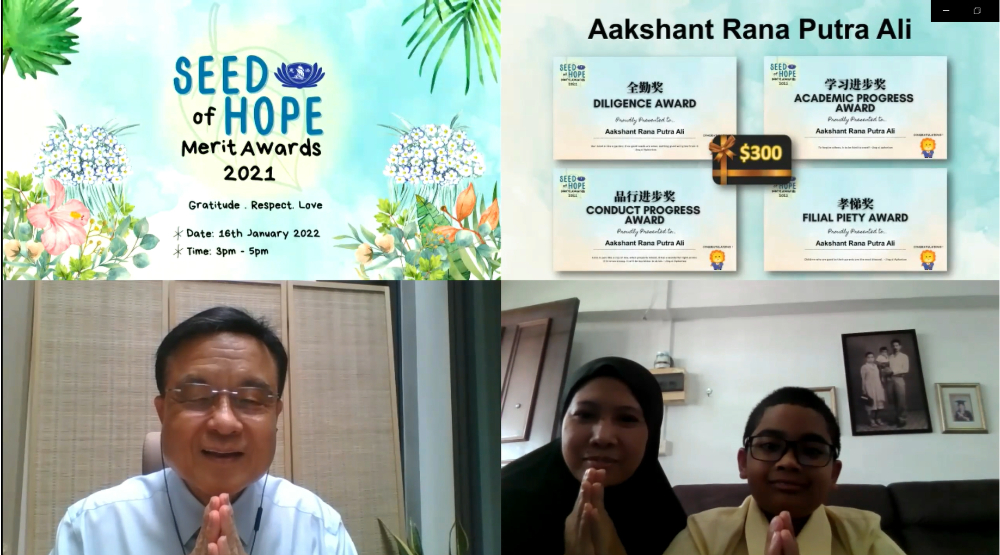 With the pandemic persisting, it continues to decrease the frequency of social interactions between people. However, through technology, the care from Tzu Chi volunteers toward the student beneficiaries saw no distance. On January 16th 2022, Tzu Chi Foundation (Singapore) held the Seeds of Hope Merit Awards Ceremony 2021. Due to the pandemic, the ceremony was held virtually instead. A total of 49 beneficiaries and their parents participated in the event.