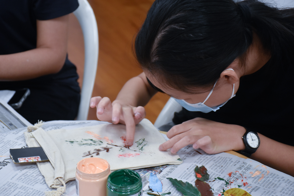 Tzu Shaos trace the dried leaves picked up from the nature park carefully on a tote bag with oil paint. Each tote bag has a unique and natural design. (Photos by Chong Mong Zhuang)