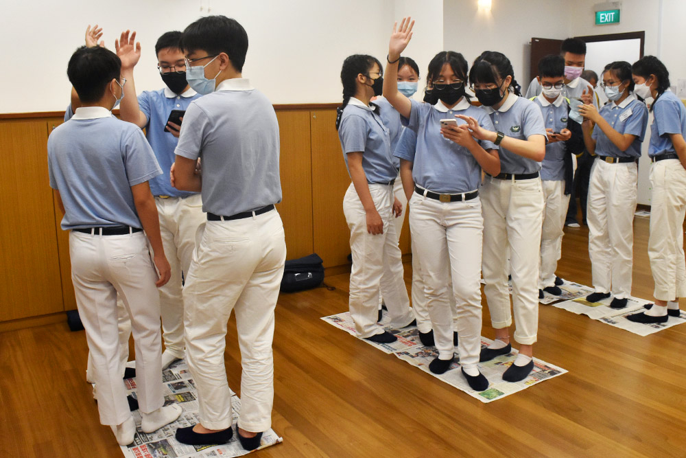At the game station of environmental protection, the whole group had to stand on a piece of newspaper to answer questions. Tzu Shao Darius Quah was impressed by the game and said, "If you answer wrongly, the newspaper will be folded in half. If you keep answering wrongly, the newspaper will become smaller and smaller, as if the earth is covered with water, and we'll fall into the sea eventually."