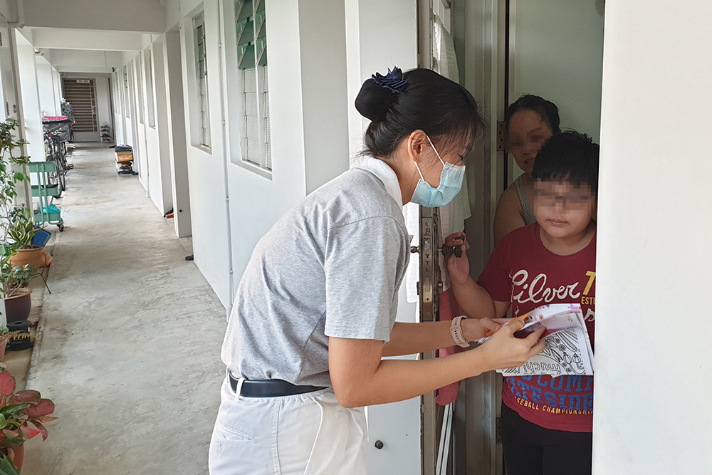 欢乐感恩会前两周,课辅计划协调走访照顾户家,给孩子派发欢乐祝福包。(摄 / 陈琴烨)