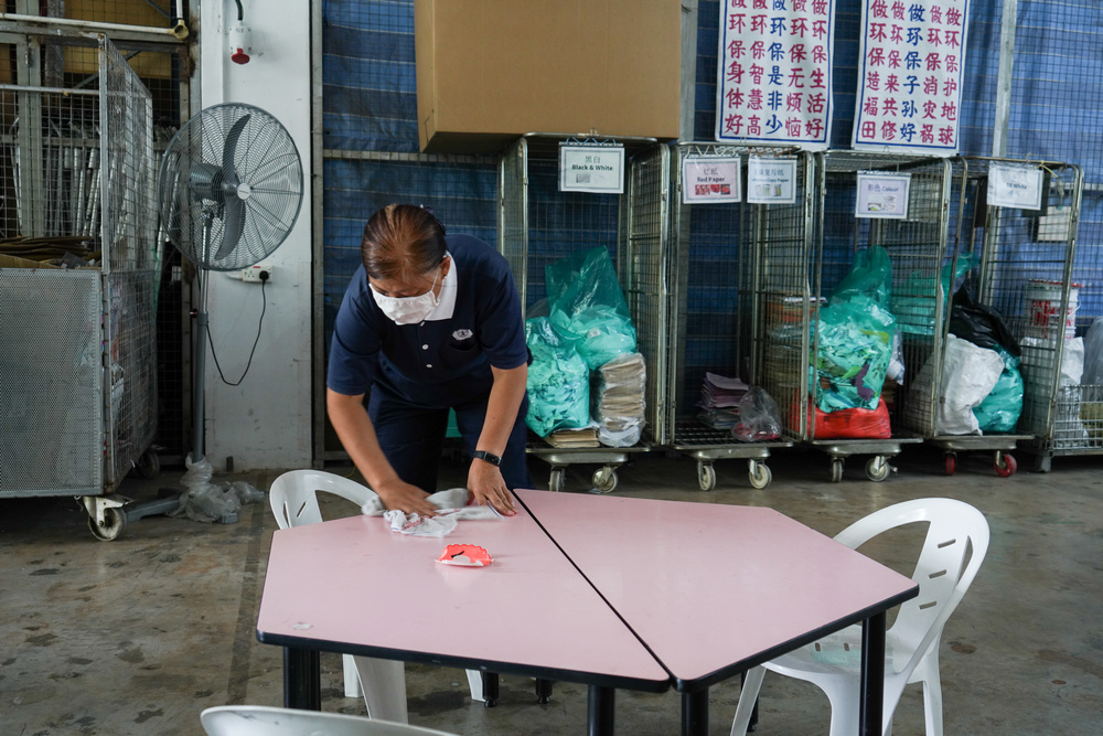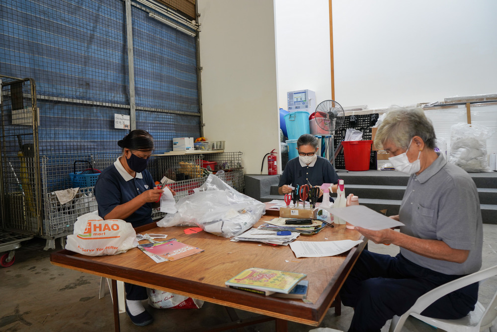 和其他年长志工一起分类纸张,黄露丝也会顺道和她们话家常,彼此关心。(摄/ 曾美珍)