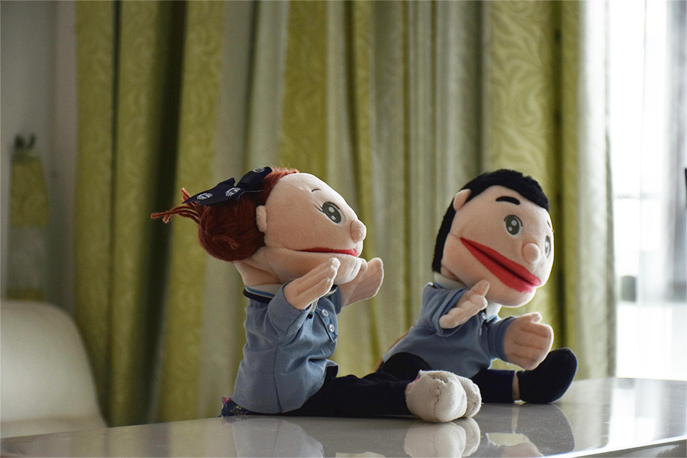 团队初次手工制作的布偶安安(右)和乐乐(左),把小朋友的个性表现得活灵活现,让课堂变得生动起来。(摄/ 李富民)
