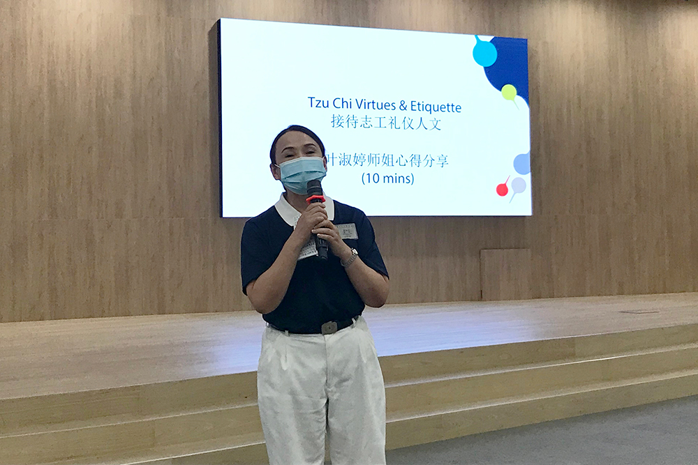 她继续说,志工的言语要讲究优雅,待人能知进退,看到有人走进中心,或是等待朋友,要把握机会说慈济,不要错失任何一个介绍慈济的良机。
