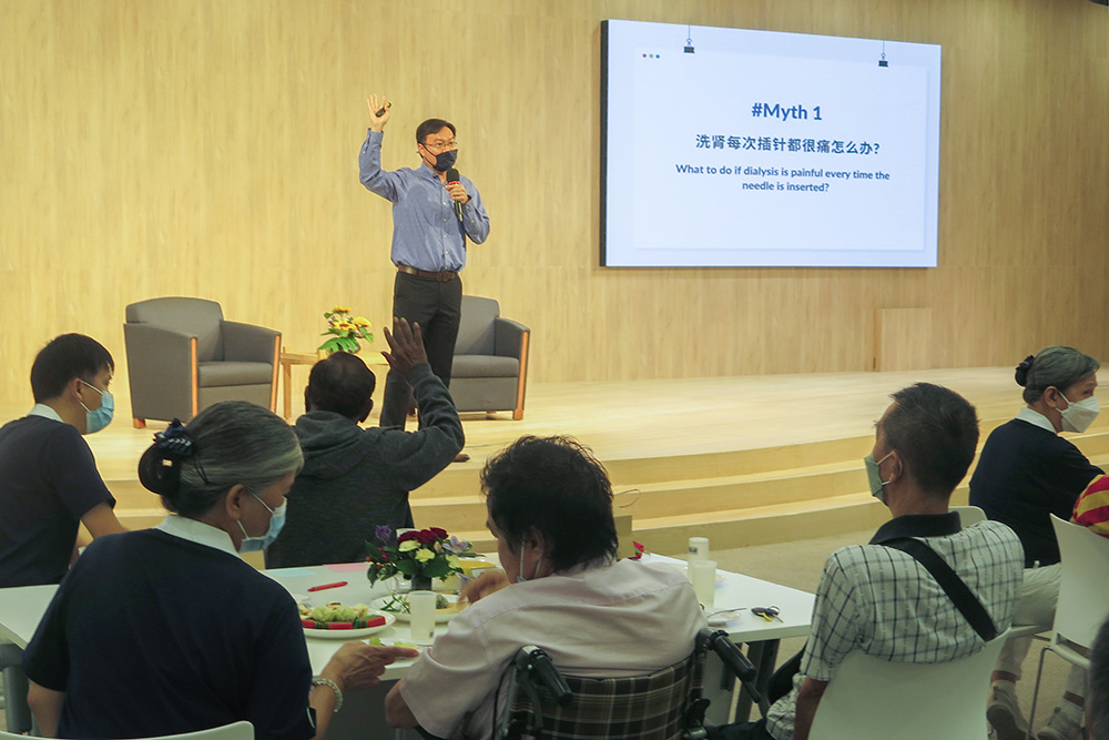 袁文祥医生以“揭穿洗肾的迷思:活得健康有意义”为题,破除患肾病后的五个常见迷思,包括“洗肾插针很痛,怎么办?”“肾友不能工作吗?”“洗肾后手脚很无力?”“洗肾就无法自由出国?”和“洗肾的生活就没有意义?”
