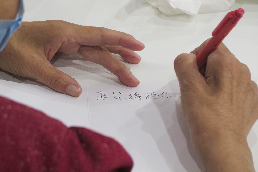 茶会其中一个环节是“回忆感恩的对象”,教育程度不高的冼美玲一笔一划写下“老公,谢谢你”,简单几字写给一路鼓励陪伴42年的先生。(摄/ 周正阳)