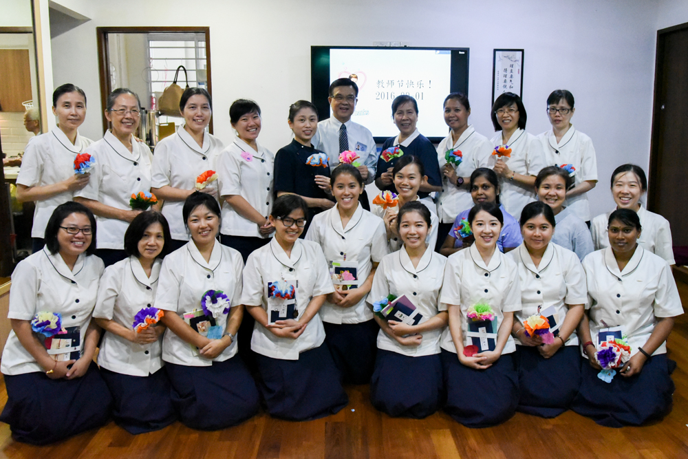 戴钰郿(后排左五)与幼教中心教职员欢度教师节。(摄/ 曾美珍)