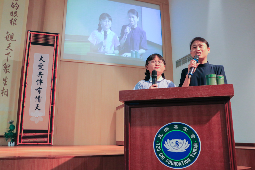 在新加坡静思堂的新芽助学金颁发典礼上,戴钰郿(右)与女儿一起担任司仪。(摄/ 黄思妮)