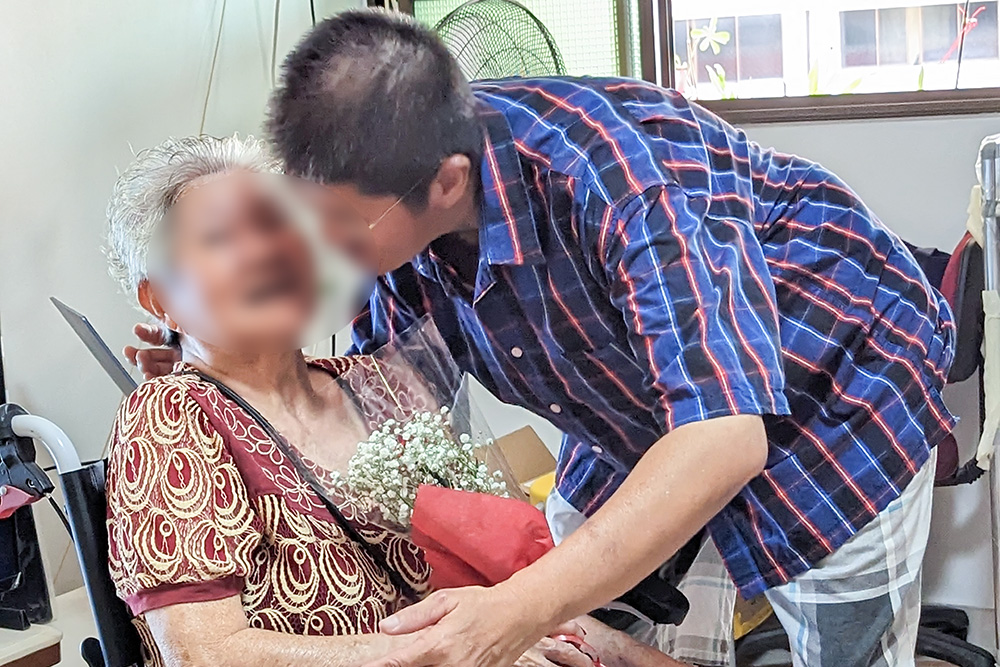 78岁的谢妈妈与儿子相依为命,在2018年中风后,她的左手麻痹,半边身体无力,多年来一直以轮椅代步,由于行动不便,很少外出。每月拜访谢家的主责访视员王素菁说:“谢妈妈一家是佛教徒,但因为生病后无法外出,困在家中,所以流动浴佛对他们来说非常有意义。”