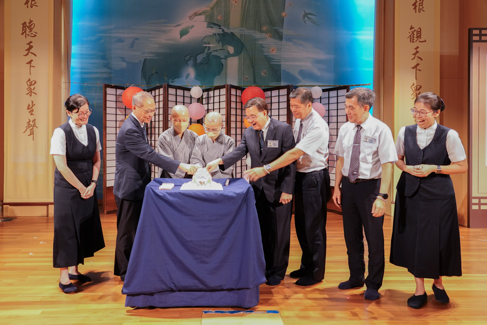 寿桃蛋糕缓缓推上台,台湾贵宾德谛师父(左四)、德泰师父(左三)与颜博文执行长(左二),以及刘瑞士执行长(右四)与新加坡执行团队,一同上台切蛋糕。(摄/ 李副腆)
