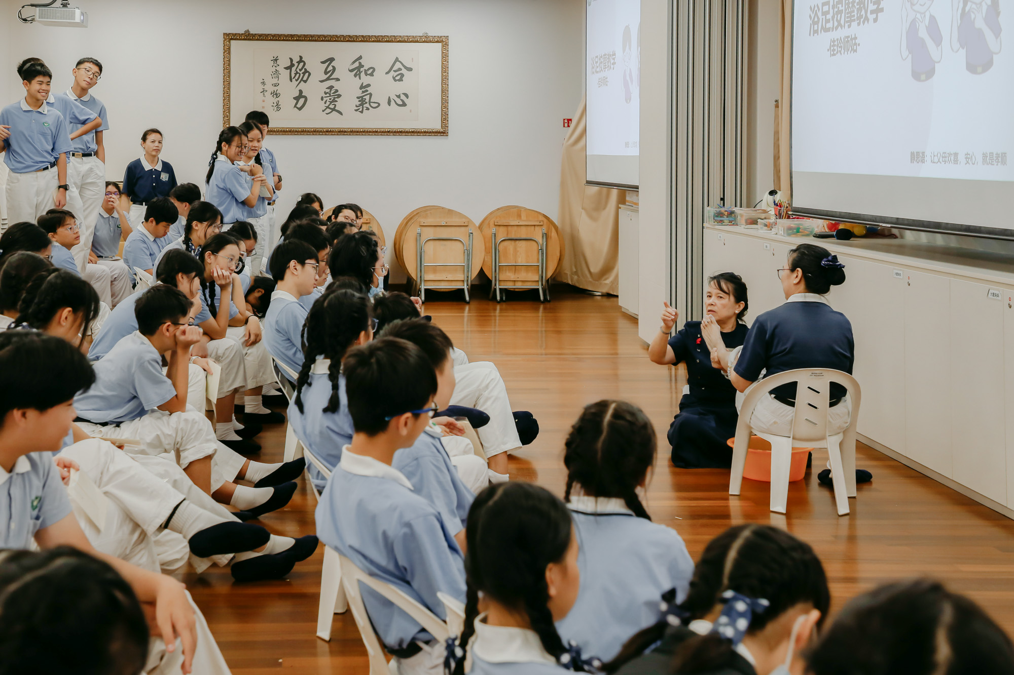 慈济社会教育推广中心的师资团队李佳玲向慈少们说明浴足的意义,并仔细示范按摩手法。摄/ 冯桂琼