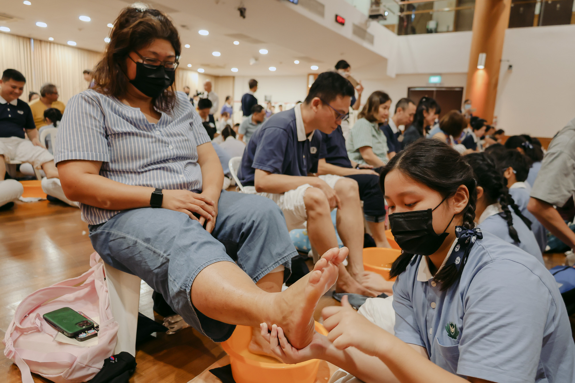 慈少们蹲下来,仔仔细细按摩父母双足,传递无声的谢意。摄/ 潘彗文