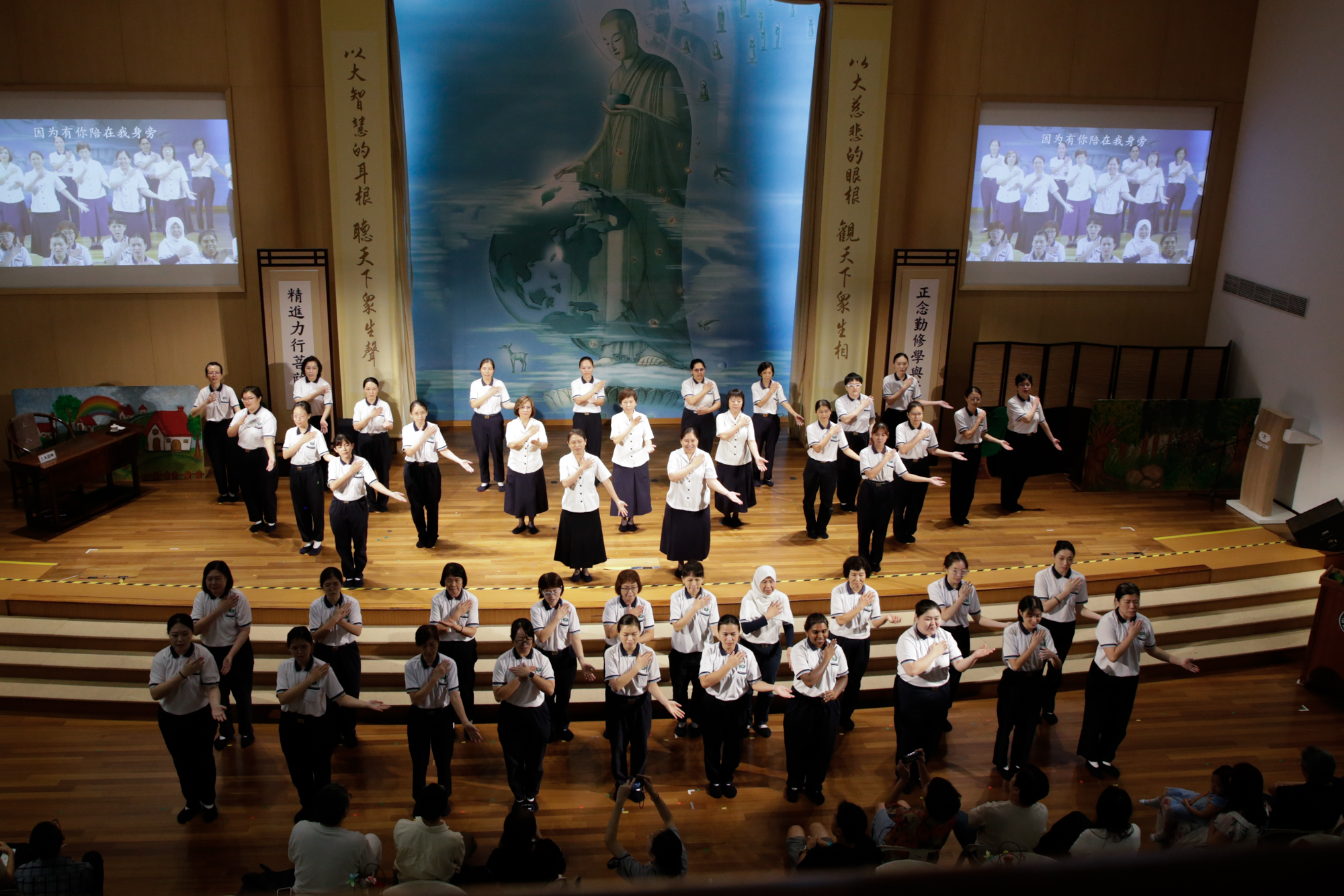 《无量法门》音乐一响,三所慈济大爱幼教中心的毕业生穿着整齐的毕业袍,头带四方帽,庄重而认真地从佛堂两侧步入会场。
