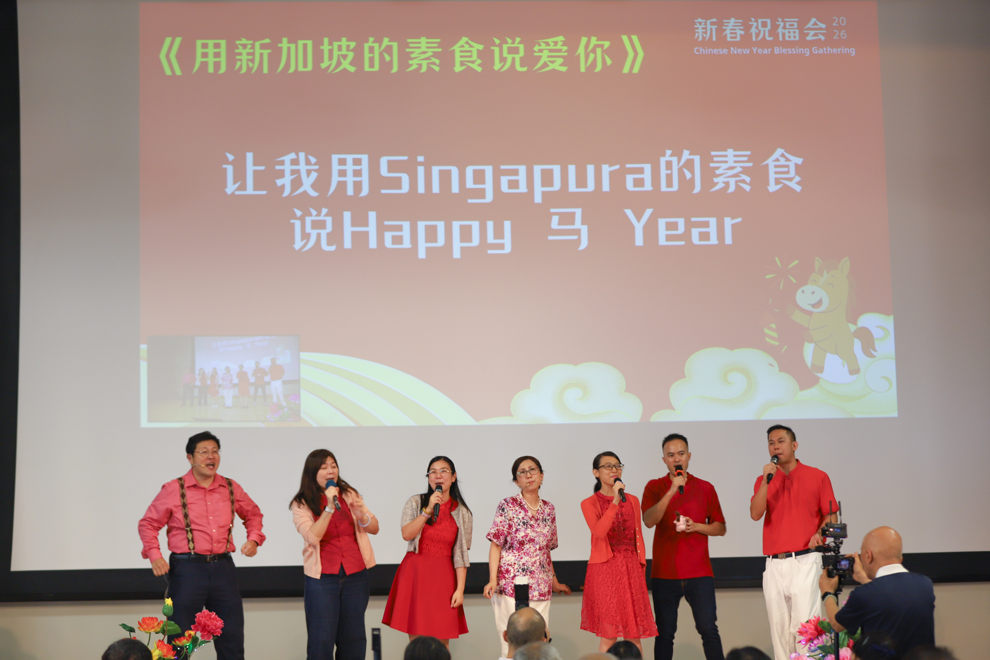 台下众人享用团圆饭,台上的节目也目不暇给。舞狮和大头娃娃共同呈现的话剧演出,传递环保的理念;志工通过歌词接龙小游戏,拉近与观众的距离;还运用巧思把《用马来西亚的天气来说爱你》一曲改编成《用新加坡的素食说爱你》,宣导蔬食的好处。